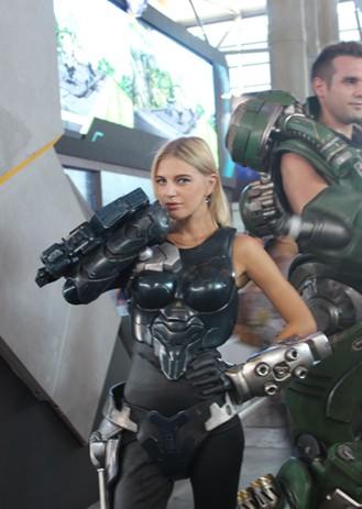 外籍美女每年都会在CJ上抢镜不少,今年也不例外。看这位英武性感的美女,满身盔甲,兵器在身也不减颜值和性感本色,金发碧眼让小编目不转睛,为CJ现场平添了不少异域风情。